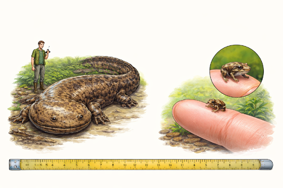 The biggest amphibians are Asian giant salamanders, 1.7 metres long. The smallest are sminthillus frogs of Cuba shorter than this word 'frog'. SOMEFACTS