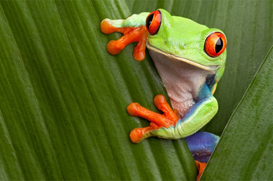 Many amphibians are colored to blend in with their surroundings. This is called camouflage. The red-eyed tree frog matches green leaves, which it grips with its sucker-like toe tips. SOMEFACTS